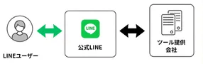 この構成の場合、公式LINEは、「LINEユーザー」と「ツール提供会社」からのメッセージ(データ)を「中継」するだけになります。